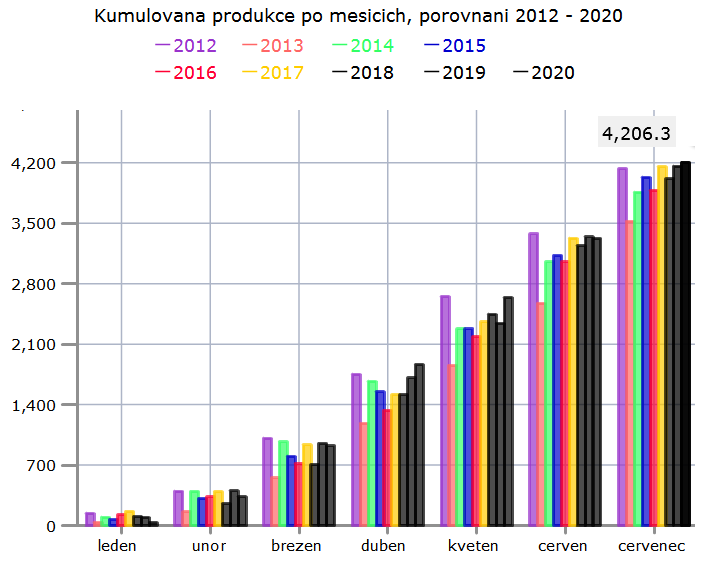 Po půlroce extrémů se zdá být zase normálnější počasí a tím i produkce FVE. Při porovnání kumulované produkce (přiložený graf) za poslední roky najednou zjistíme, že duben v podstatě vykompenzoval nižší produkci května a června a nakonec se vše tváří jako obvykle. Prezident může klidně spát a my splácet zbytky úvěrů.
