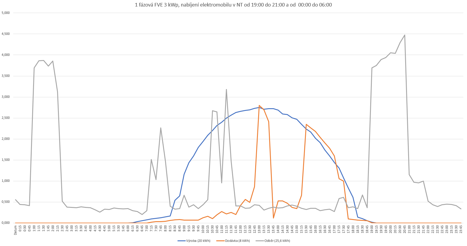 Šedá je grafem spotřeby, tedy tím, co bude nutné zaplatit. Večerní a noční špičky způsobené nabíjením plug-in hybridu, tedy automobilu zčásti na elektrický pohon, jsou odběrem v nízkém tarifu a tedy nepálí tak, jako průběh šedé barvy po dobu výroby. Obzvláště morálně nevhodné jsou zuby způsobené vařením na třífázovém sporáku, to je úkol pro odborníka!