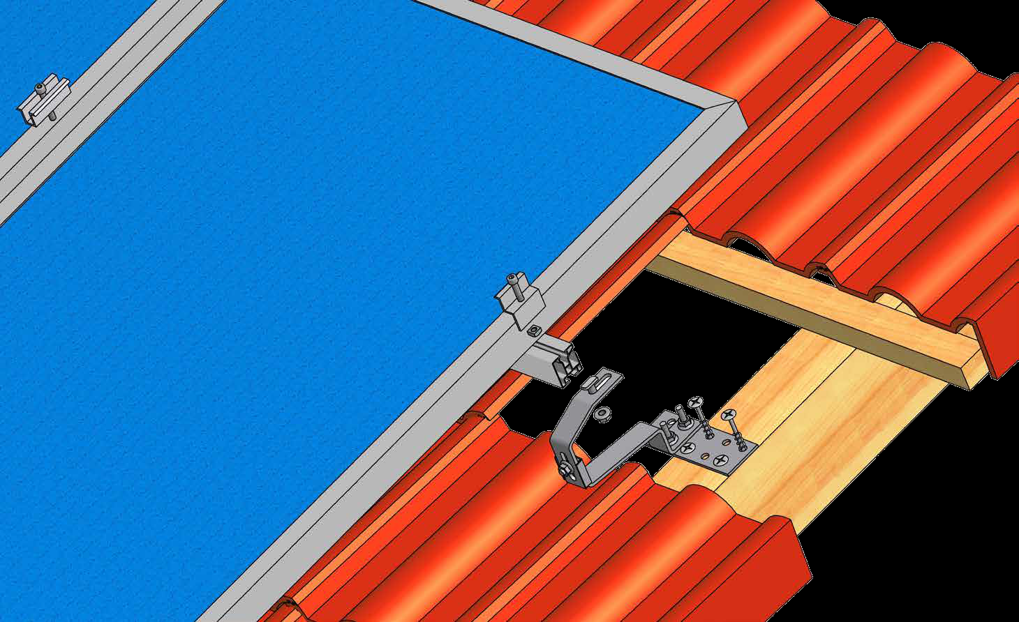Set je určen pro šikmé taškové střechy z pálených nebo betonových tašek, obsahuje všechny standardní potřebné šásti včetně spojovacího materiálu pro uchycení 2 řad po sedmi fotovoltaických panelech. Určeno pro solární panely standardní šíře kolem 1 metru, nezávisle na výšce panelu. Vždy počítáme s dvěma řadami nosníků pod jednu řadu panelů.
