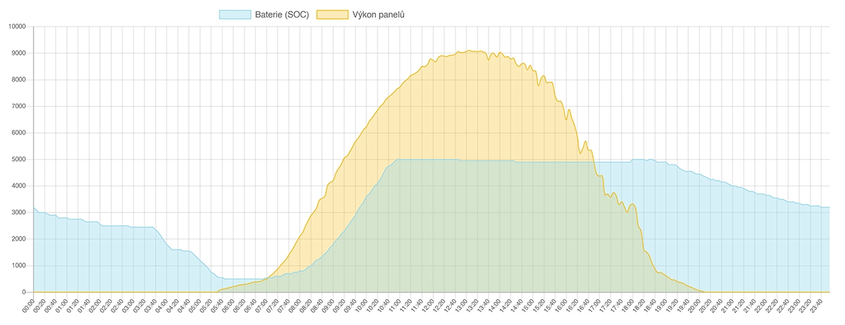Baterie začíná den nabitá na 60 % z předchozího večera. V ranních hodinách její nabití postupně klesá, protože domácnost čerpá energii na provoz spotřebičů a panely ještě nevyrábějí dostatečně. Jakmile ale slunce nabralo na síle, výroba z panelů pokrývá aktuální spotřebu domu a zároveň nabíjí baterie. Kolem 11. hodiny dopoledne je zcela nabito.